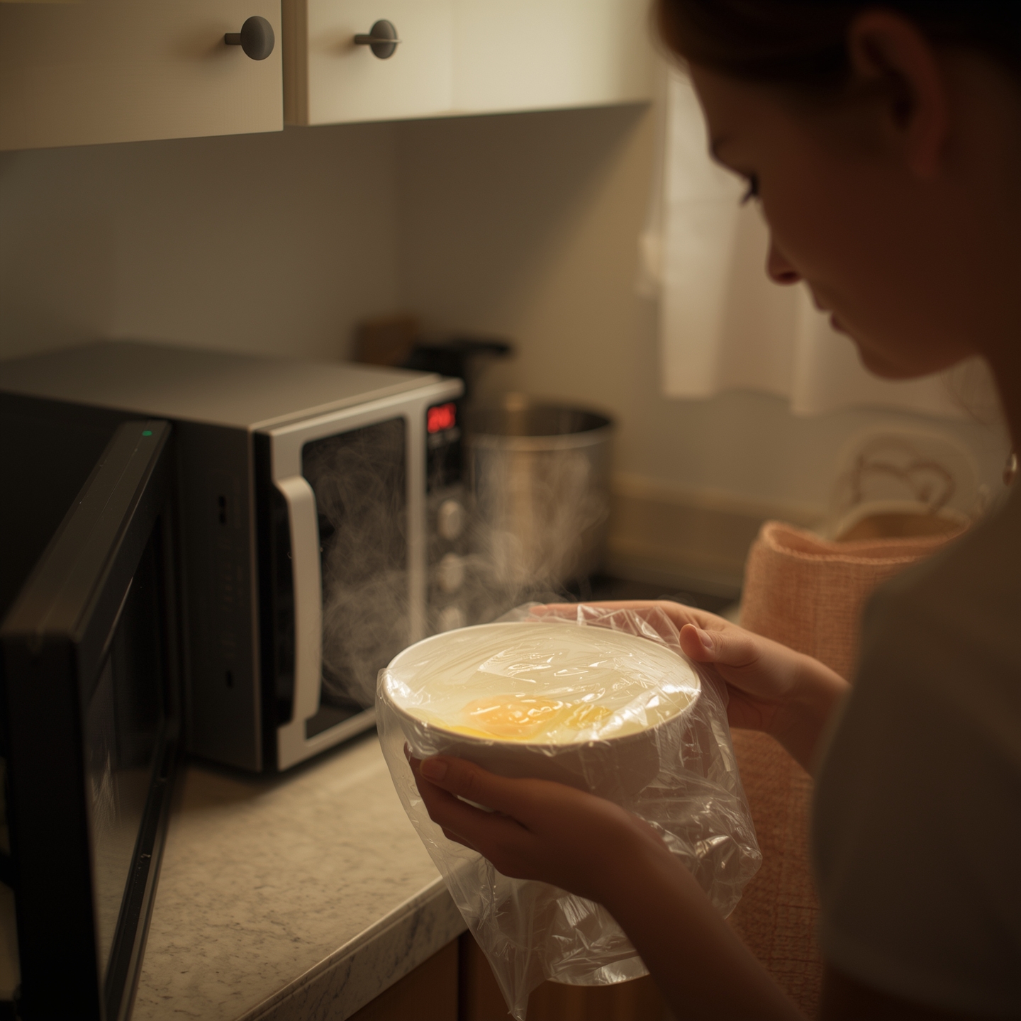 3. 랩을 씌우고 구멍을 뚫은 뒤, 전자레인지에 4분간 돌려줍니다.